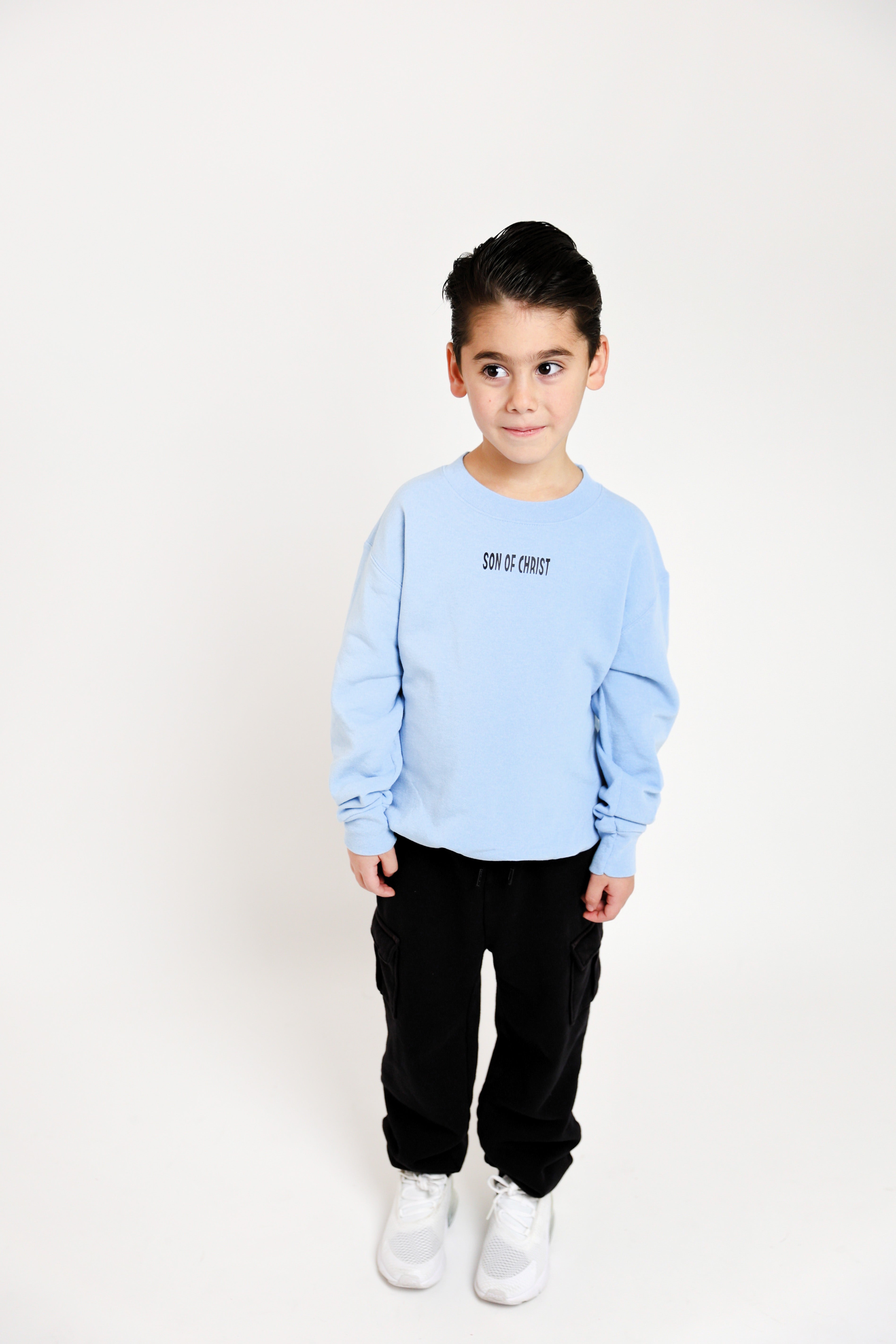 This kids crewneck features Son of Christ on the front chest and a unique graphic on the back of Jesus walking hand in hand with a little boy — a reminder to every child that they are a son of God.